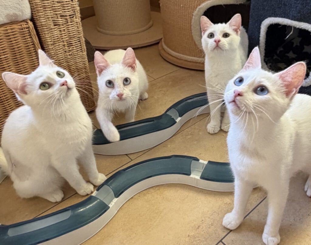 4 weiße Schneeflöckchen-Katzen suchen paarweise ein liebevolles zu Hause. Sie sind aus 1 Wurf und verstehen sich dementsprechend sehr gut. Geboren wurden sie im September 2025, sind seitlich kastriert (ist auf den Fotos zu sehen), haben kompletten Impfschutz (auch die Tollwutimpfung), sind gechipt und der Bluttest auf FIV/FELV war bei allen negativ. 2 Mädchen haben […]