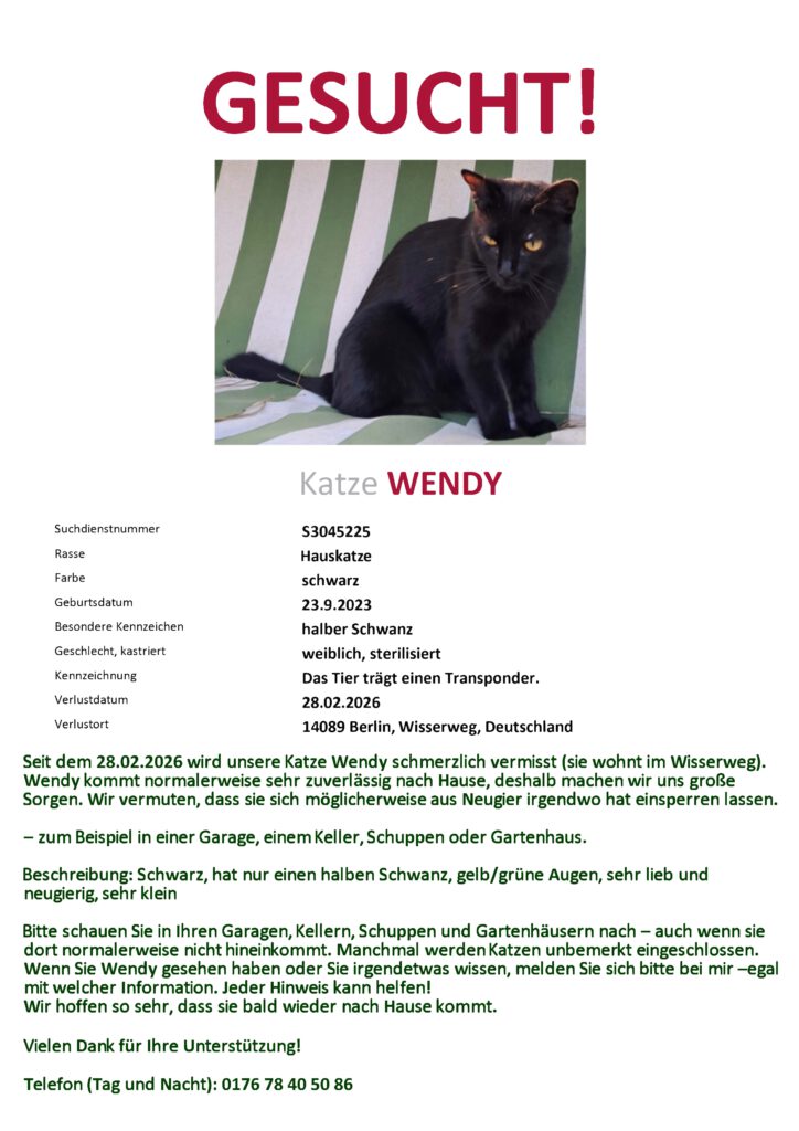 Name Ihres Tieres: Pepsi Geschlecht: weiblich Alter: ca. 8-9 Jahre Vermisst seit: 23.05.2025 PLZ/Ort: 14612 Falkensee Chip/Tattoo: Ja Kastriert: Ja Besondere Merkmale: Pepsis rechtes Auge ist trüb und am ihrem rechten Vorderbein ist das Fell etwas dünn Sonstiges: Sie ist ängstlich, aber zutraulich Bei Hinweisen wenden Sie sich bitte an Frau Zreik: T: 0151 11 243 283 […]