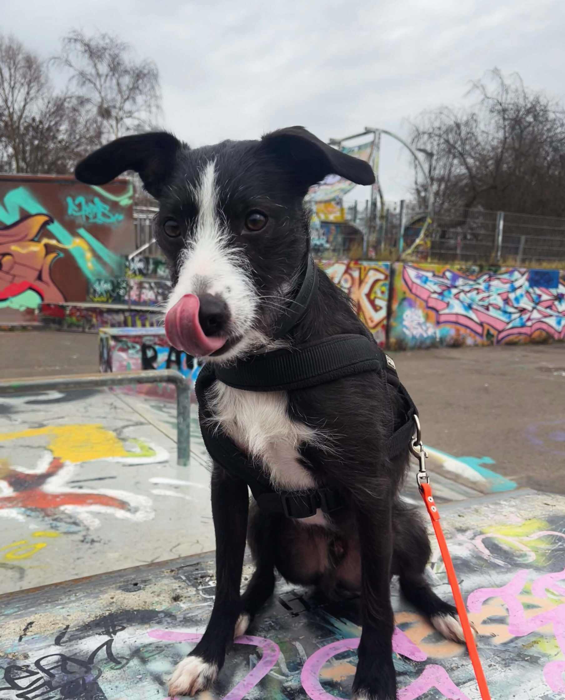 Fynn ist stubenrein, kennt einige Kommandos und Tricks und liebt Futter über alles – das ist auch der beste Weg, sein Vertrauen zu gewinnen. Er braucht Routine, Stabilität und unbedingt einen ruhigen Rückzugsort (eine dunkle Box oder ruhige Ecke), wenn ihm etwas zu viel wird. Alleinebleiben fällt ihm momentan noch schwer, aber mit Geduld, Training und vielleicht einem souveränen Zweithund kann er das sicher lernen.