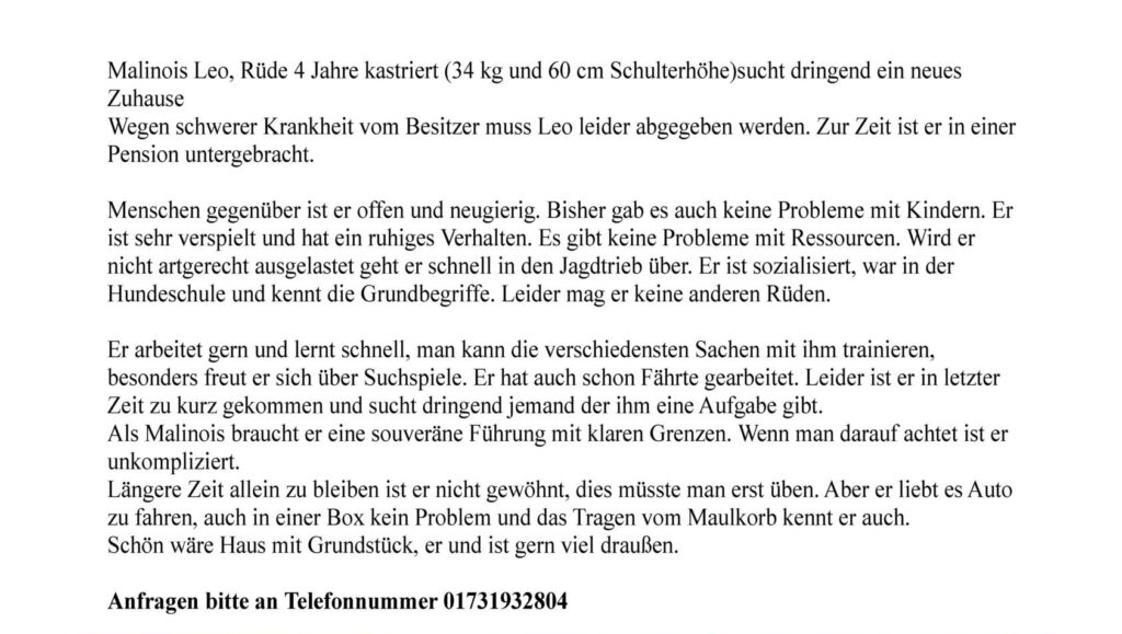 Bei dieser Suchmeldung handelt es sich um eine Vermittlungsunterstützung. Wir kennen das Tier nicht und sind auch nicht Vermittlungspartner bei der Adoption! Wenn Sie Fragen zu dem Tier haben und/oder weitere Informationen benötigen, nutzen Sie bitte ausschließlich die angegebenen Kontaktdaten.